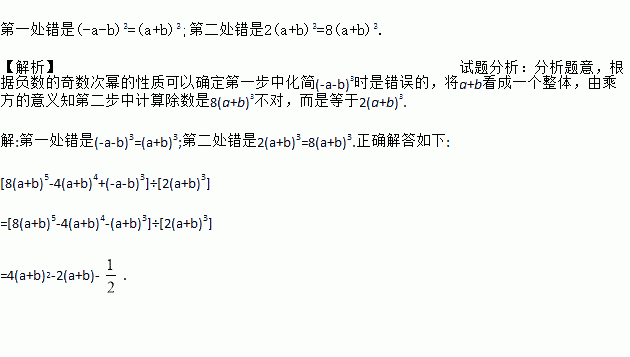 µÚÒ»´¦´íÊÇ(-a-b)3=(a+b)3;µÚ¶þ´¦´íÊÇ2(a+b)3=8(a+b)3. ¡¾½âÎö¡¿ÊÔÌâ·ÖÎö£º·ÖÎöÌâÒ⣬¸ù¾Ý¸ºÊýµÄÆæÊý´ÎÃݵÄÐÔÖÊ¿ÉÒÔÈ·¶¨µÚÒ»²½Öл¯¼ò(-a-b)3ʱÊÇ´íÎóµÄ£¬½«a+b¿´³ÉÒ»¸öÕûÌ壬Óɳ˷½µÄÒâÒåÖªµÚ¶þ²½ÖмÆËã³ýÊýÊÇ8(a+b)3²»¶Ô£¬¶øÊǵÈÓÚ2(a+b)3. ½â:µÚÒ»´¦´íÊÇ(-a-b)3=(a+b)3;µÚ¶þ´¦´íÊÇ2(a+b)3=8(a+b)3.ÕýÈ·½â´ðÈçÏÂ: ...