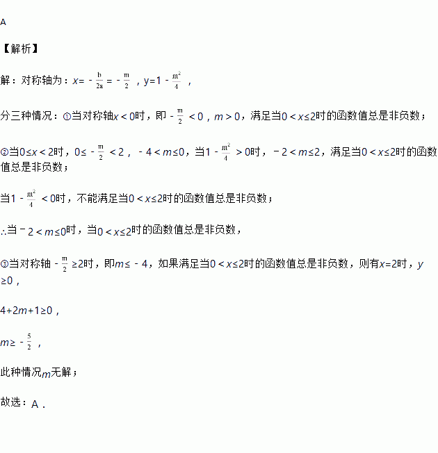对于二次函数y=x2+mx+1,当0<x≤2时的函数值总是非负数,则实数m的取值范围为( )