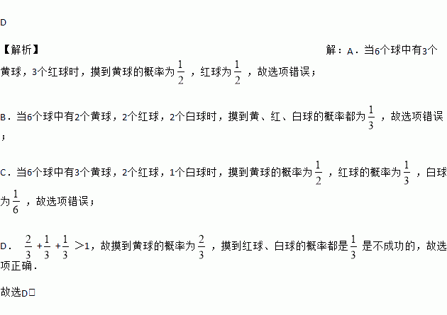 B. 摸到黄、红、白球的概率都为![]()