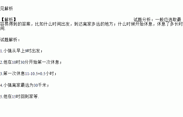小强骑自行车去交游,下图表示他离家的距离y(千米)与所用的时间x(小时)之间的函数图象,根据图象所提供的数据,请你写出3个信息.