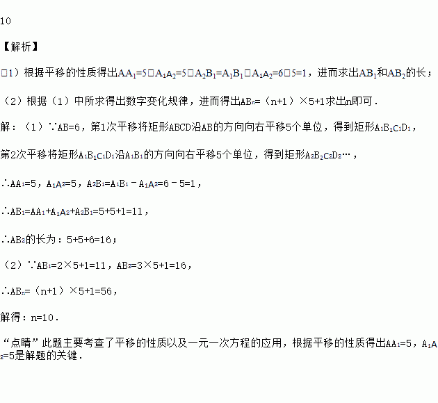 如图,长方形ABCD中,AB=6,第一次平移长方形ABCD沿AB的方向向右平移5个单位,得到长方形A1B1C1D1,第2次平移将长方形A1B1C1D1沿A1B1的方向向右平移5个单位,得到长方形A2B2C2D2…,第n次平移将长方形An﹣1Bn﹣1Cn﹣1Dn﹣1沿An﹣1Bn﹣1的方向平移5个单位,得到长方形AnBnCnDn(n>2),若ABn的长度为56,则n=_.