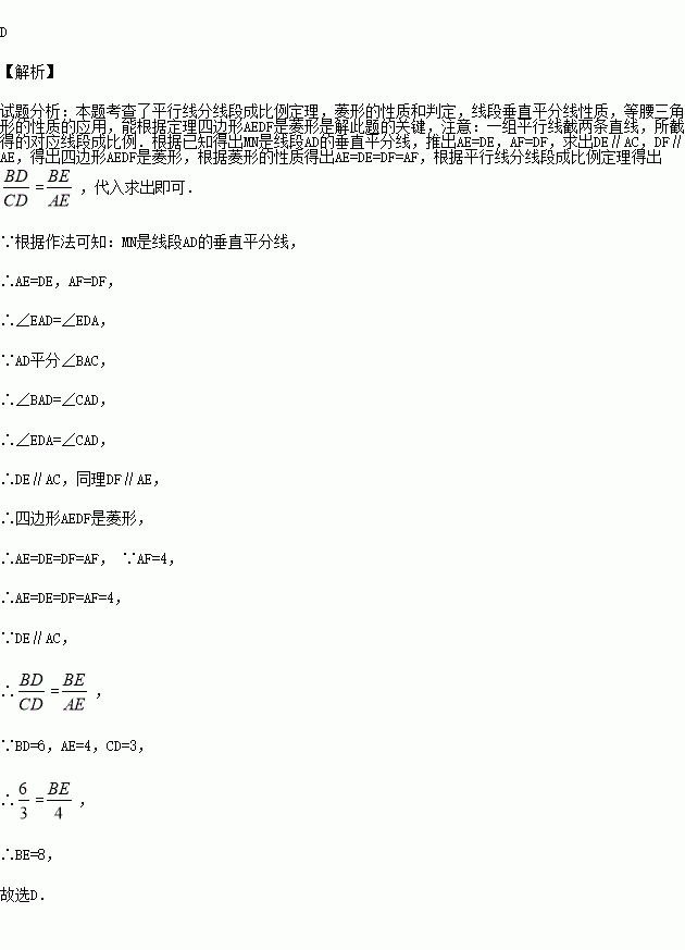 AD的长为半径在AD两侧作弧,交于两点M、N;第二步,连接MN分别交AB、AC于点E、F;第三步,连接DE、DF.若BD=6,AF=4,CD=3,则BE的长是( )