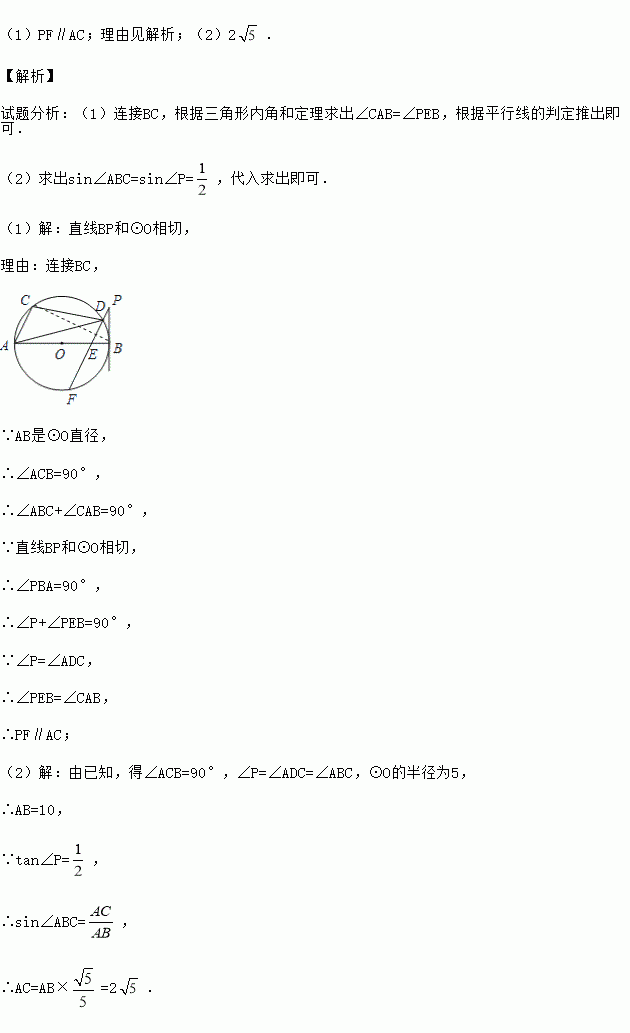 如图,AB是⊙O的直径,点A、C、D在⊙O上,BP是⊙O的切线,连接PD并延长交⊙O于F、交AB于E,若∠BPF=∠ADC.