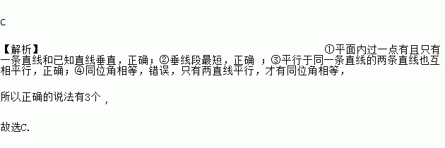 C 【解析】①平面内过一点有且只有一条直线和已知直线垂直,正确;②垂线段最短,正确 ;③平行于同一条直线的两条直线也互相平行,正确;④同位角相等,错误,只有两直线平行,才有同位角相等, 所以正确的说法有3个, 故选C.