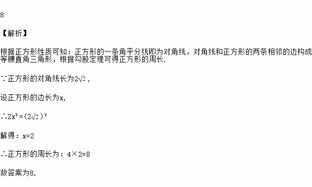若正方形的一条对角线长为2,则该正方形的周长为________.