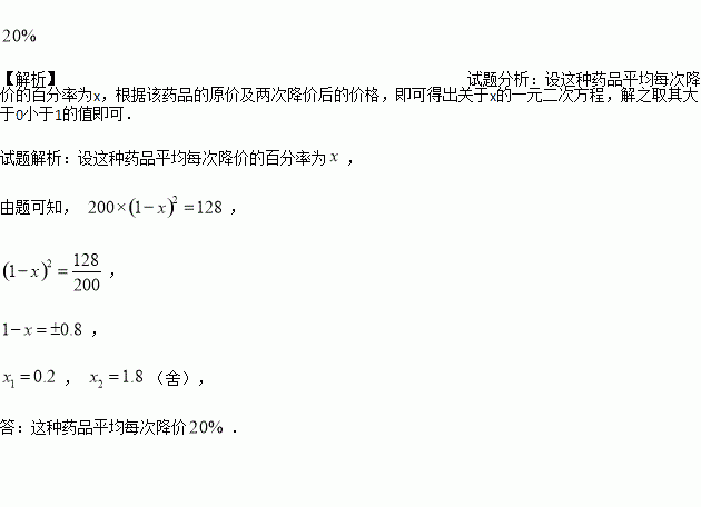 某地为了解决市民看病贵的问题,决定下调药品的价格.某种药品经过连续两次降价后,由每盒元下调至元,求这种药品平均每次降价的百分率.