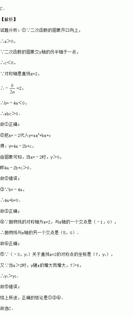①abc>0;②4a﹣2b+c<0;③4a+b=0;④抛物线与x轴的另一个交点是(5,0);⑤点(﹣3,y1),(6,y2)都在抛物线上,则有y1<y2.