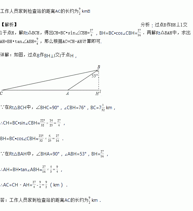 km,位于点B南偏西76°方向的点C处,求工作人员家到检查站的距离AC.(参考数据:sin76°≈
