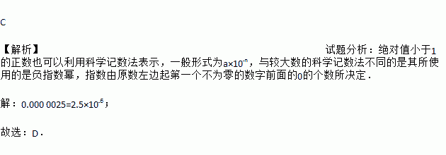 C 【解析】试题分析:绝对值小于1的正数也可以利用科学记数法表示,一般形式为a×10﹣n,与较大数的科学记数法不同的是其所使用的是负指数幂,指数由原数左边起第一个不为零的数字前面的0的个数所决定. 【解析】 0.000 0025=2.5×10﹣6; 故选:D.