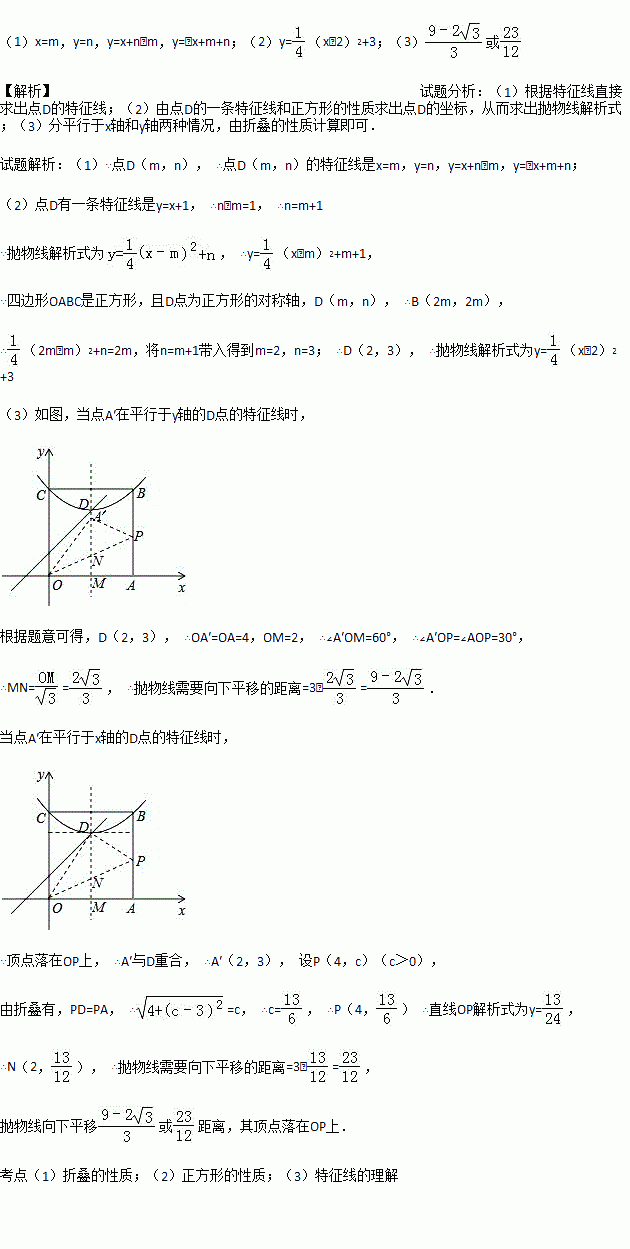 (3)点P是AB边上除点A外的任意一点,连接OP,将△OAP沿着OP折叠,点A落在点A′的位置,当点A′在平行于坐标轴的D点的特征线上时,满足(2)中条件的抛物线向下平移多少距离,其顶点落在OP上?