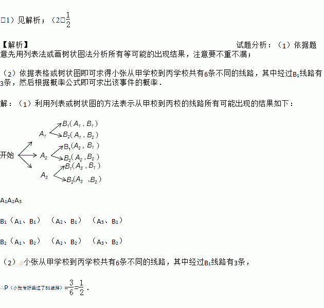 (1)见解析;(2) 【解析】试题分析:(1)依据题意先用列表法或画树状图法分析所有等可能的出现结果,注意要不重不漏; (2)依据表格或树状图即可求得小张从甲学校到丙学校共有6条不同的线路,其中经过B1线路有3条,然后根据概率公式即可求出该事件的概率. 【解析】 (1)利用列表或树状图的方法表示从甲校到丙校的线路所有可能出现的结果如下: A1A2A3 B1(A1、B...