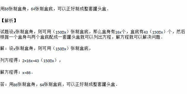 用白铁皮做罐头盒,每张白铁皮可制盒身16个或盒底43个,一个盒身与两个盒底配成一套罐头盒。现有150张白铁皮,用多少张白铁皮制盒身、多少张白铁皮制盒底可以正好制成整套罐头盒而无余料?