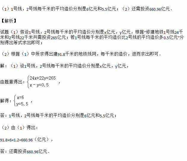 为方便市民出行,减轻城市中心交通压力,长沙市正在修建贯穿星城南北、东西的地铁1、2号线.已知修建地铁1号线24千米和2号线22千米共需投资265亿元;若1号线每千米的平均造价比2号线每千米的平均造价多0.5亿元.