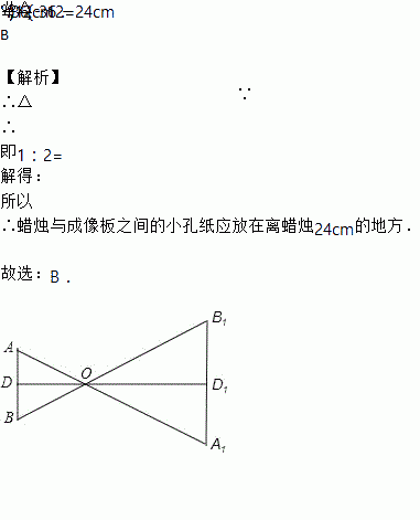 如图,物理课上张明做小孔成像实验,已知蜡烛与成像板之间的距离BB'为36cm,要使烛焰的像A′B′是烛焰AB的2倍,则蜡烛与成像板之间的小孔纸板应放在离蜡烛( )cm的地方.
