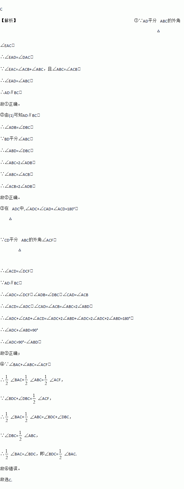 C 【解析】①∵AD平分△ABC的外角∠EAC, ∴∠EAD=∠DAC, ∵∠EAC=∠ACB+∠ABC,且∠ABC=∠ACB, ∴∠EAD=∠ABC, ∴AD∥BC, 故①正确。 ②由(1)可知AD∥BC, ∴∠ADB=∠DBC, ∵BD平分∠ABC, ∴∠ABD=∠DBC, ∴∠ABC=2∠ADB, ∵∠ABC=∠ACB,...