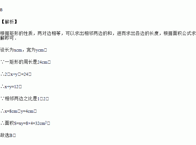 已知一矩形的周长是24cm,相邻两边之比是1:2,那么这个矩形的面积是( )