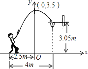 一位篮球运动员在距离篮圈中心水平距离4m处起跳投篮,球沿一条抛物线运动,当球运动的水平距离为2.5m时,达到最大高度3.5m,然后准确落入篮框内.已知篮圈中心距离地面高度为3.05m,在如图所示的平面直角坐标系中,下列说法正确的是( )