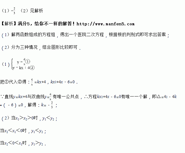 (2)若直线y=kx+4与双曲线交于点M(x1,y1),N(x2,y2).当x1>x2,请借助图象比较y1与y2的大小.