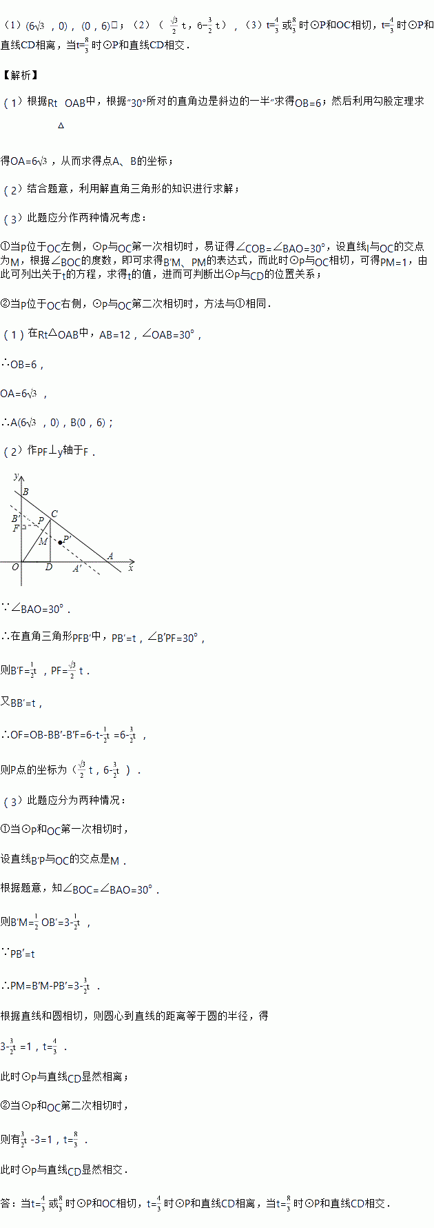 (3)过O作OC⊥l于C,过C作CD⊥x轴于D,问:t为何值时,以P为圆心、1为半径的圆与直线OC相切?并写出此时⊙P与直线CD的位置关系.