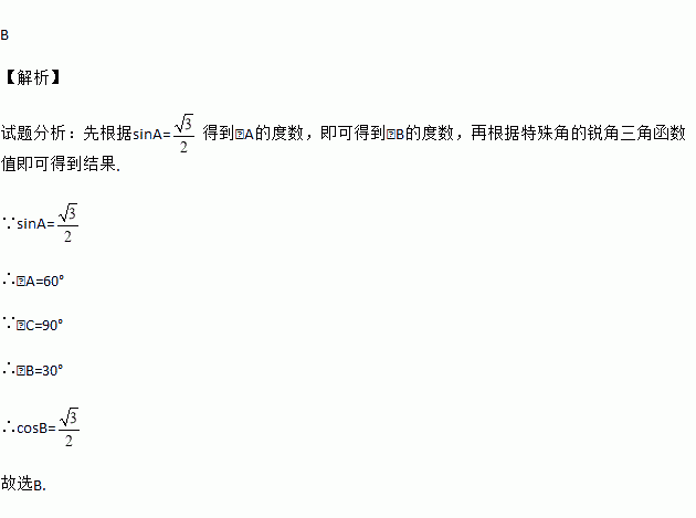 在△ABC中,∠C=90°,sinA=,则cosB的值为( )