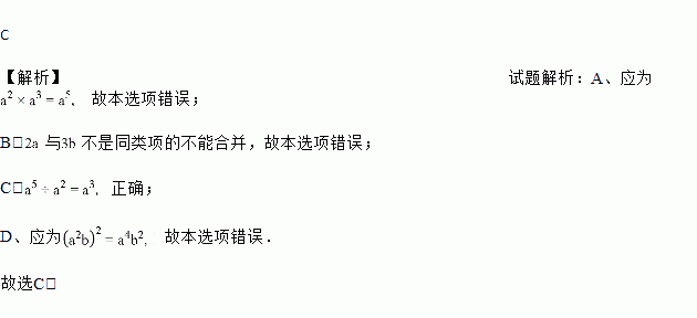 A. a2×a3=a6 B. 2a+3b=5ab C. a5÷a2=a3 D. (a2b)2=a4b