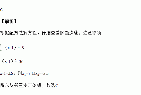 (x-1)2=9步骤配方步骤如下:①(x-1)2=36 ② x-1=±6 ③x=±7 ④ 即x1=7 x2=-7,其中开始错误的步骤是( )
