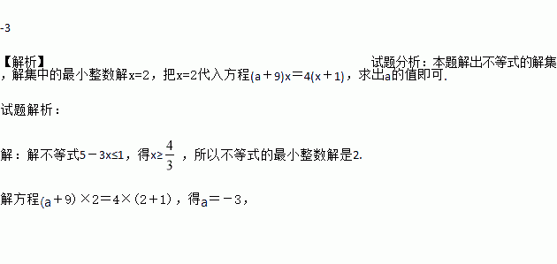 已知不等式5-3x≤1的最小整数解是关于x的方程(a+9)x=4(x+1)的解,求a的值.
