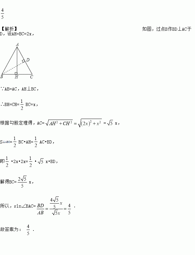 如图,在△ABC中,AB=AC,AH⊥BC,垂足为点H,如果AH=BC,那么sin∠BAC的值是_____.