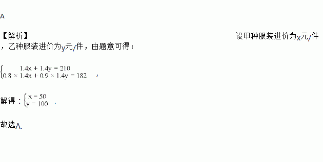 某商场购进甲、乙两种服装后,都加价40%标价出售.“春节”期间商场搞优惠促销,决定将甲、乙两种服装分别按标价的八折和九折出售.某顾客购买甲、乙两种服装共付182元,两种服装的标价之和为210元,则这两种服装的进价各是( )