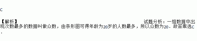 C 【解析】试题分析:一组数据中出现次数最多的数据叫做众数,由条形图可得年龄为20岁的人数最多,所以众数为20.故答案选C.