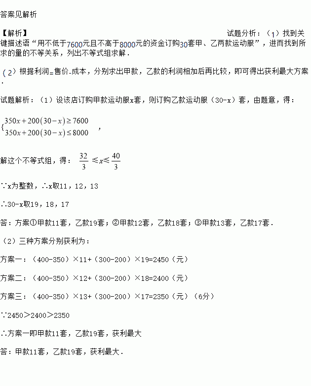 某服装店欲购进甲、乙两种新款运动服。甲款每套进价350元,乙款每套进价200元。该店计划用不低于7600元且不高于8000元的资金订购甲、乙两款运动服共30套