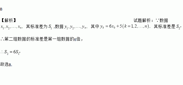 已知一组数据x1,x2,…,xn,其标准差为S1,另有一组数据y1,y2,…,yn,其中yk=6xk+5(k=1,2,…,n),其标准差是S2,则正确的是( )