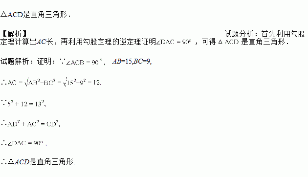 已知:如图,四边形ABCD中,∠ACB=90°,AB=15,BC=9,AD=5,DC=13.试判断△ACD的形状,并说明理由;