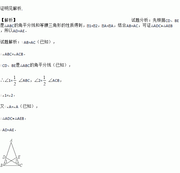 已知:如图△ABC中,AB=AC,CD、BE是△ABC的角平分线.求证:AD=AE.
