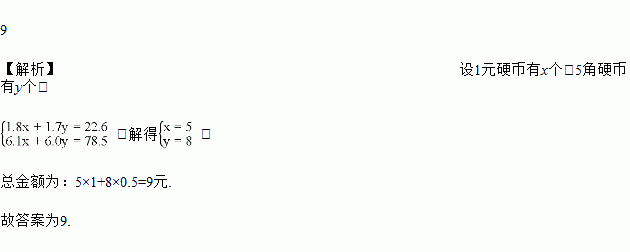 七(1)班小明同学通过《测量硬币的厚度与质量》实验得到了每枚硬币的厚度和质量,数据如下表.他从储蓄罐取出一把5角和1元硬币,为了知道总的金额,他把这些硬币叠起来,用尺量出它们的总厚度为22.6mm,又用天平称出总质量为78.5g,请你帮助小明同学算出这把硬币的总金额为_元.