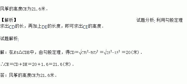 八(2)班小明和小亮同学学习了“勾股定理”之后,为了测得如图风筝的高度CE,他们进行了如下操作: