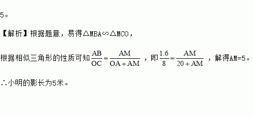 如图,路灯距离地面8米,身高1.6米的小明站在距离灯的底部(点O)20米的A处,则小明的影子AM长为 米.