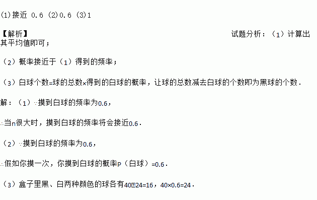 (1)接近 0.6 (2)0.6 (3)1 【解析】试题分析:(1)计算出其平均值即可; (2)概率接近于(1)得到的频率; (3)白球个数=球的总数×得到的白球的概率,让球的总数减去白球的个数即为黑球的个数. 【解析】 (1)∵摸到白球的频率为0.6, ∴当n很大时,摸到白球的频率将会接近0.6. (2)∵摸到白球的频率为0.6, ∴假如你摸一次,你摸...
