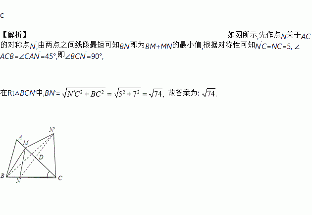 如图,锐角三角形ABC中,∠C=45°,N为BC上一点,NC=5,BN=2,M为边AC上的一个动点,则BM+MN的最小值是( )