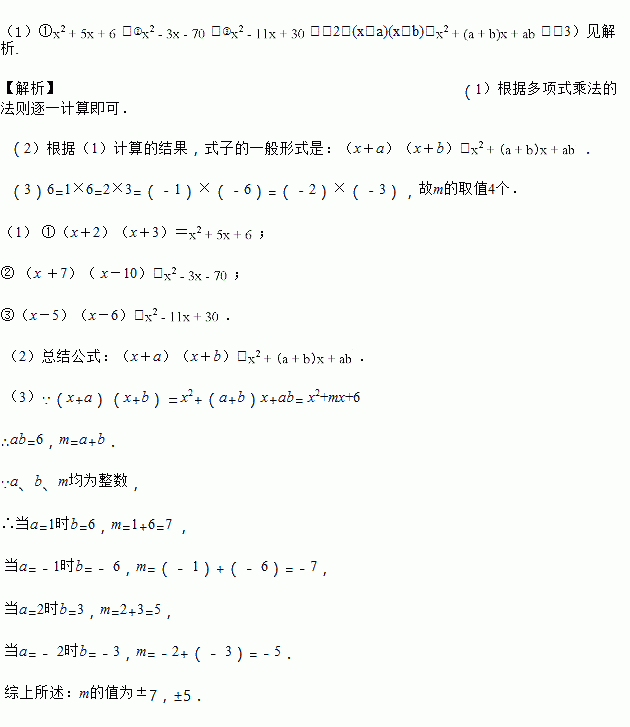 (1)计算:①(x+2)(x+3)= ;② (x +7)( x-10)= ;③(x-5)(x-6)= .