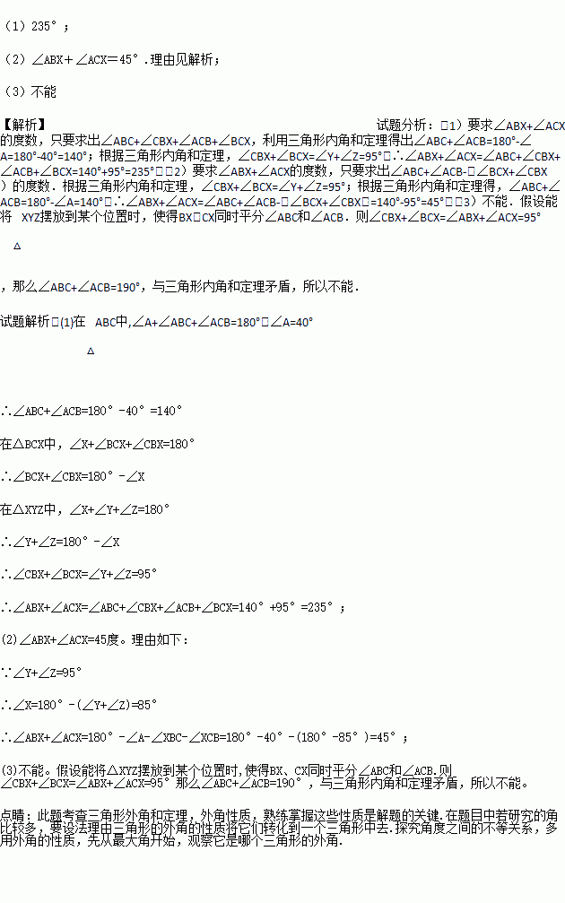 已知:在△ABC和△XYZ中,∠A=40°,∠Y+∠Z=95°,将△XYZ如图摆放,使得∠X的两条边分别经过点B和点C.