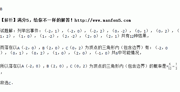 (德智外国语期末)如图,一个质地均匀的正四面体上依次标有数字-2,0,1,2,连续抛掷两次,朝下一面的数字分别是a,b,将其作为M点的横、纵坐标,则点M(a,b)落在以A(-2,0),B(2,0),C(0,2)为顶点的三角形内(包括边界)的概率是( )