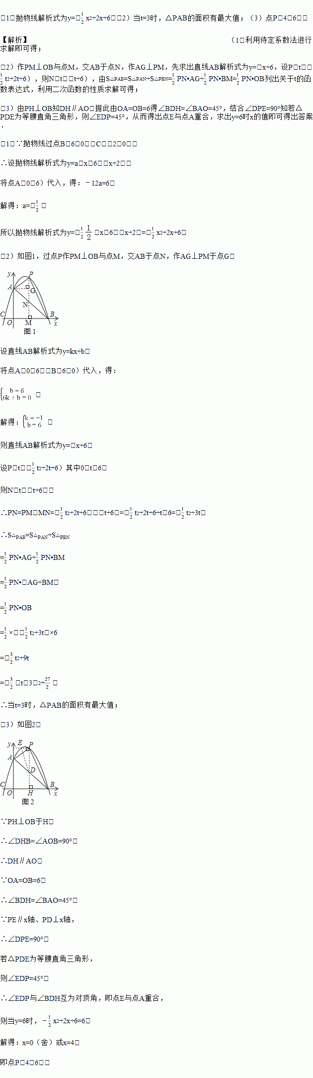 已知:如图,抛物线y=ax2+bx+c与坐标轴分别交于点A(0,6),B(6,0),C(﹣2,0),点P是线段AB上方抛物线上的一个动点.