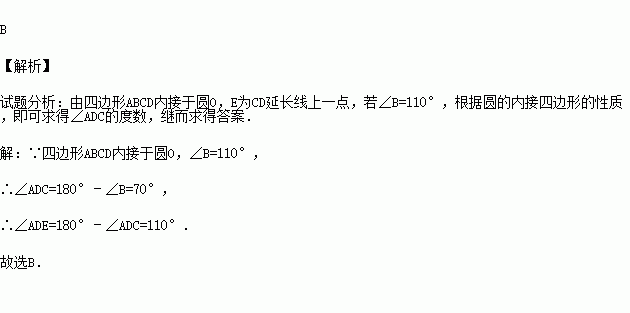 (2015秋•河西区期中)如图,四边形ABCD内接于圆O,E为CD延长线上一点,若∠B=110°,则∠ADE的度数为( )