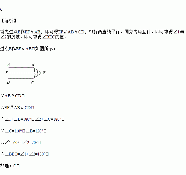 如图,AB∥CD,∠C=110°,∠B=120°,则∠BEC等于 ( )