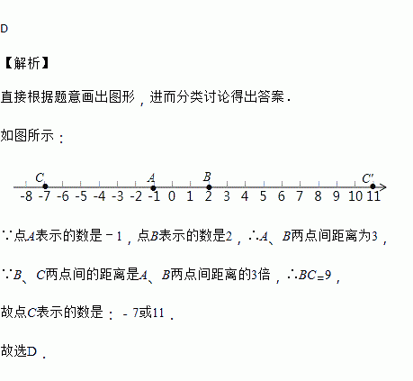 已知点A、B、C分别是数轴上的三个点,点A表示的数是﹣1,点B表示的数是2,且B、C两点间的距离是A、B两点间距离的3倍,则点C表示的数是( )