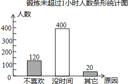 分析:(1)先求出2006年全市中小学生每天锻炼未超过1小时共有540人,再求没时间”的人数是540-120-20=400;