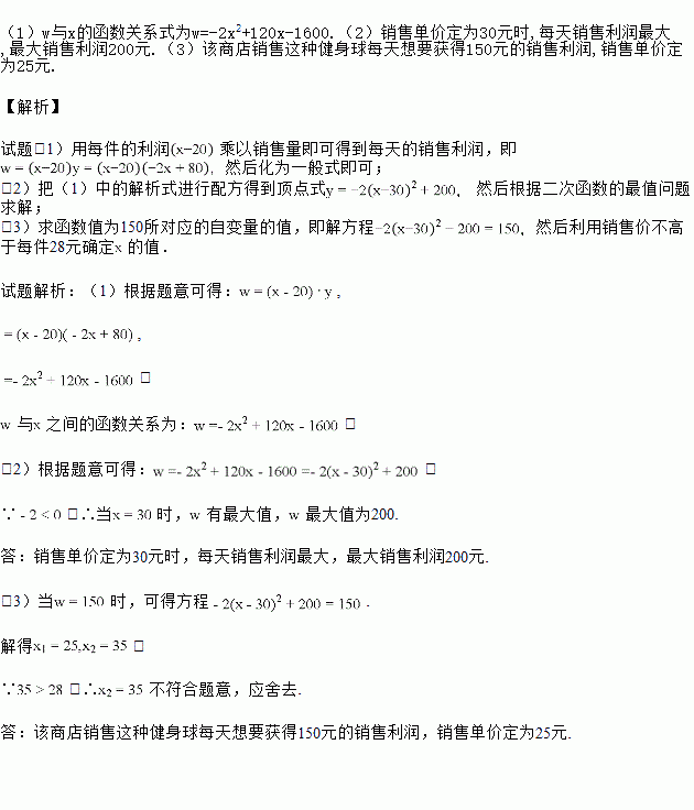 某商店经销一种健身球,已知这种健身球的成本价为每个20元,市场调查发现,该种健身球每天的销售量y(个)与销售单价x(元)有如下关系:y=﹣2x+80(20≤x≤40),设这种健身球每天的销售利润为w元.