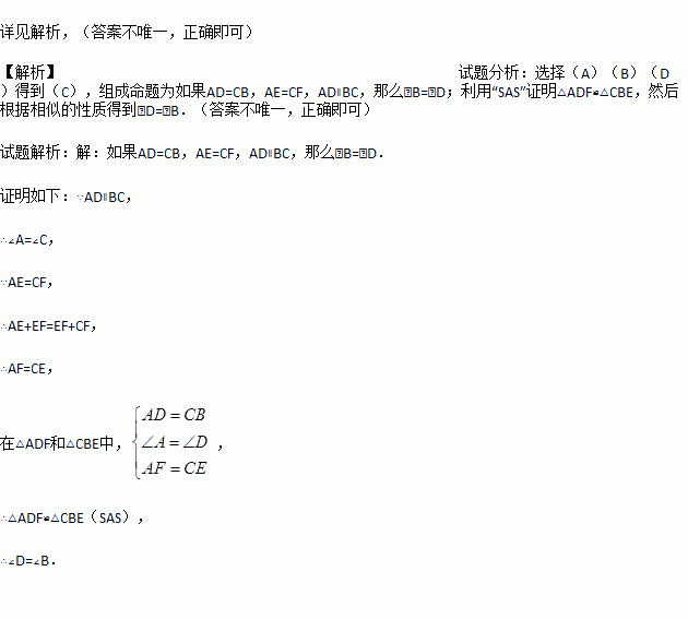 在△AFD和△BEC中,点A、E、F、C在同一直线上,有下面四个论断:(1)AD=CB;(2)AE=CF;(3)∠B=∠D;(4)AD∥BC.请用其中三个作为条件,余下一个作为结论,编一道数学问题,并写出证明过程.