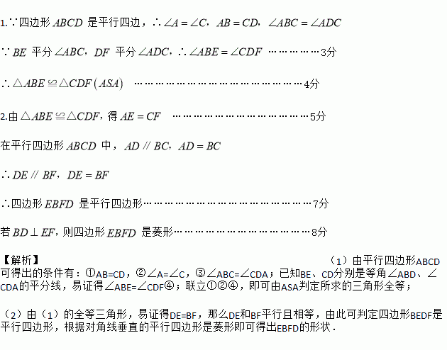 如图,在□ABCD中,BE平分∠ABC交AD于点E,DF平分∠ADC交BC于点F.
